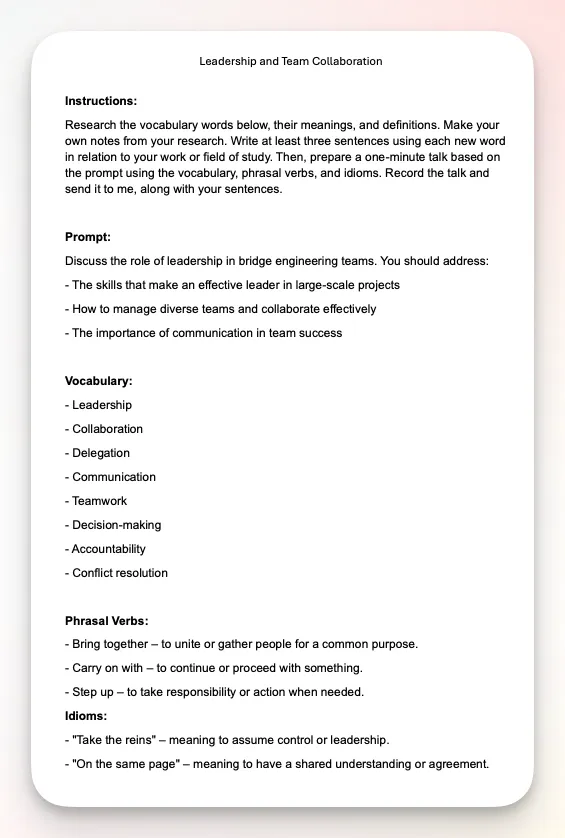 Get a practical, work-relevant prompt designed to build skills in professional English. Each prompt mirrors scenarios you might encounter in bridge engineering, architecture, or design, helping you use English confidently in real-life situations.